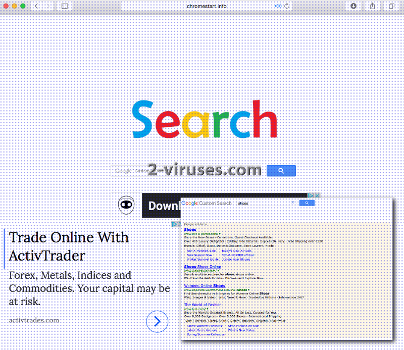 ChromeStart.info virus - How to remove January 23, 2017 By Giedrius Majauskas When your preferred application for browsing fully launches, you should pay attention to the websites that are opened as your home, default search provider and new tab pages. For the most part, if user has not individually selected domains to be in these positions, the witnessed pages are going to be automatically arranged by the browser you utilize. For example, Chrome browser usually opens Google page, and Mozilla Firefox frequently displays a page with shortcuts, transferring to domains that you regularly visit. The problem is when browsers’ preferences are re-organized by a malware parasite. For example, ChromeStart.info virus is a browser hijacker that can infect your system and assign its questionable searching network as your priority during browsing. If this modification takes place in your system, you should not sit and do nothing about it. This passive reaction won’t make ChromeStart.info virus disappear. Of course, it might be easy to become confused, since this browser hijackers is called ChromeStart: if you are using Chrome, you might accept its presence as a safe regularity. However, this website is a fake search engine that is used to promote various websites/services/software that will be up to no good. ChromeStart.info virus and its nasty, nasty habits You should accept the fact ChromeStart.info virus fosters an unreliable searching platform. The main red flags that are easily observable include: this search facility fails to provide an EULA document and a Privacy Policy. Without the terms of ChromeStart.info utilization clearly indicated, it is impossible to distinguish whether your sessions are going to be treated discretely. If ChromeStart.info virus does not employ certain security measures to make sure that your browsing remains private, you should not continue to select it to execute your search queries. Of course, ChromeStart.info virus does not waste its time or resources on producing results to these keywords on its own: it selects a poor-quality copy of Google. The impact of the browser hijacker in this page is that the unreliable creators add their own advertisements, listed above other generated URLs. Links that are promoted by the ChromeStart.info virus can include content that belongs to third-parties, attempting to spread malware infections. By visiting unknown domains, you are risking your privacy, since tracking cookies from unidentified sources can be used to track your session or be permanently planted in your hard drive. We should also express strong concerns over the fact that your device might be jeopardized by malware parasites, starting with the initial infection of ChromeStart.info virus. Browser hijackers are often able to install more infections to accompany them. For this reason, you might notice that completely out of the blue, bizarre system optimizers or toolbars start to be featured. In order to avoid this, you should spot an infection with malware at an early stage and remove it. ChromeStart.info virus is not an alternative search engine you should select instead of more reliable ones. How does ChromeStart.info virus get cozy in your system? ChromeStart.info virus can come together with a free application that you download from the Internet. During installation processes, always attentively read EULA documents: it might be that the selected program opts to replace your browsers’ preferences. This is not a condition you should agree. In addition to that, please follow every step of the Setup Wizard to reassure that no additional software is recommended to be installed alongside your selected application. To refuse these offers, select advanced/custom mode for the installation process. This will allow you to deselect additional programs from being prepared for usage. Additionally, stop visiting domains that offer questionable facilities and support content of ill-repute. If you are mainly concerned with removing ChromeStart.info virus from your system, we can offer you instructions for manual removal. However, if you do not wish to get your hands dirty, you can consider automatic removal option. For it, you have to use an anti-malware tool. Try out any of these three programs: Spyhunter. We are sure that any of these tools will successfully eliminate this browser hijacker. Chromestart Info Virus quicklinksChromeStart.info virus and its nasty, nasty habitsHow does ChromeStart.info virus get cozy in your system?Automatic Malware removal toolsManual removal of ChromeStart.info virusHow to remove ChromeStart.info virus using Windows Control PanelHow to remove ChromeStart.info virus from macOSAutomatic Malware removal tools Download Spyhunter for Malware detection(Win) Note: Spyhunter trial provides detection of parasites and assists in their removal for free. limited trial available, Terms of use, Privacy Policy, Uninstall Instructions, Download Combo Cleaner for Malware detection(Mac) Note: Combo Cleaner trial provides detection of parasites and assists in their removal for free. limited trial available, Terms of use, Privacy Policy, Uninstall Instructions, Refund Policy , Manual removal of ChromeStart.info virus How to remove ChromeStart.info virus using Windows Control Panel Many hijackers and adware like ChromeStart.info virus install some of their components as regular Windows programs as well as additional software. This part of malware can be uninstalled from the Control Panel. To access it, do the following. Start→Control Panel (older Windows) or press Windows Key→Search and enter Control Panel and then press Enter (Windows 8, Windows 10). Choose Uninstall Program (if you don't see it, click in the upper right next to "View by" and select Category). Go through the list of programs and select entries related to ChromeStart.info virus . You can click on "Name" or "Installed On" to reorder your programs and make ChromeStart.info virus easier to find. Cl