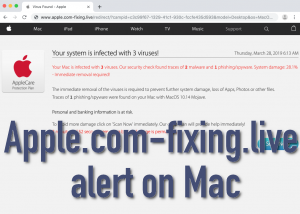 Apple.com-fixing.live alert on Mac - How to remove March 29, 2019 By Giedrius Majauskas Apple.com-fixing.live pop-up alerts specifically attack Mac computers and their browsers, which is pretty logical from the name of the website. When you suddenly see these pop-ups, pay attention to the fact that this will not be happening just once. There might be several consequent notifications originating from the malicious website attempting to scare you with many pretty deceitful statements. This tutorial explains the origin of apple.com-fixing.live and provides you with the ways to fix your hijacked browser. Com Fixing Alert On Mac quicklinksSource of apple.com-fixing.live online scamHow could adware install itself on your MacHow to remove apple.com-fixing.live pop-upsAutomatic Malware removal tools Download Spyhunter(Win) Note: Spyhunter trial provides detection of parasites and assists in their removal for free. limited trial available, Terms of use, Privacy Policy, Uninstall Instructions, Download Combo Cleaner(Mac) Note: Combo Cleaner trial provides detection of parasites and assists in their removal for free. limited trial available, Terms of use, Privacy Policy, Uninstall Instructions, Refund Policy , Apple.com-fixing.live alerts report numerous frustrating statements regarding the condition of your Mac. For example, you may be told about leakages in the security of your Mac OS X, the availability of malware, trojan horses and other threats. The real intention of this scary campaign is to persuade you into downloading and installing rogue security applications. To persuade you to do that, apple.com-fixing.live offers you to click on the integrated “Scanning Now” button supposedly to perform a system check. This is a fake scanning, of course, however, once it is completed, fake scan results will be similarly displayed by the alert. This is all done to force you into downloading and installing Mac Tweak Pro or other examples of rogue applications. The alert says that this application aims to fix these reported issues and delete reported malware. It is quite sad to recognize that all such scan reports are totally fabricated, but the worst part of the story is that some Mac owners were scared into downloading these “recommended” rogue applications, which may be the result of more essential troubles to happen with their computers in the future. Apple.com-fixing.live faulty notifications normally contain this scary text, no matter what Mac browser was used to display it: Your system is infected with 3 viruses! Your Mac is infected with 3 viruses. Our security check found traces of 2 malware and 1 phishing/spyware. System damage: 28.1% – Immediate removal required! The immediate removal of the viruses is required to prevent further system damage, loss of Apps, Photos or other files. Traces of 1 phishing/spyware were found on your Mac with MacOS 10.14 Mojave. Personal and banking information is at risk. To avoid more damage click on ‘Scan Now’ immediately. Our deep scan will provide help immediately! 4 minute and 25 seconds remaining before damage is permanent. Source of apple.com-fixing.live online scam Apple.com-fixing.live fake alerts are produced by adware in your Mac. It is recommended that you scan your device properly in order to identify and eliminate malicious utilities, aware or PUPs that are now in control of your Mac and its browsers. How could adware install itself on your Mac Many adware programs, including the one causing apple.com-fixing.live pop-ups could be installed during the installation of free software through different freeware download resources. Sometimes users do not pay enough attention to important detailed provided by freeware installers. So, they skip reading detailed information regarding the free software and simply click on “Next” or “I agree” buttons. This way they permit a lot of other software to be easily injected into their Macs. In many instances with Mac computers adware can be also installed by means of fake Adobe Flash Player update alerts. Finally, it is sad to admit that sometimes the security software installed on Mac computers does not really perform its function quite well and might miss such unauthorized installation of PUPs. How to remove apple.com-fixing.live pop-ups Most of the suspicious programs that could cause such problems for your Mac may be found in the list of Mac applications. So, the first thing you do to remove apple.com-fixing.live alerts manually are to access the list of your Mac applications. You may sort these applications by date of their installation. If you locate the latest programs and do not remember installing them directly, then you may freely trash these applications. Fixing your browser is another step you should accomplish. You need to check the list of your browser add-ons (extensions) and clean the items that could similarly produce such pop-ups randomly. For a thorough checkup of your system, we strongly advise you to scan your Mac with the Spyhunter to fully fix all your security issues automatically. Automatic Malware removal tools Download Spyhunter for Malware detection(Win) Note: Spyhunter trial provides detection of parasites and assists in their removal for free. limited trial available, Terms of use, Privacy Policy, Uninstall Instructions, Download Combo Cleaner for Malware detection(Mac) Note: Combo Cleaner trial provides detection of parasites and assists in their removal for free. limited trial available, Terms of use, Privacy Policy, Uninstall Instructions, Refund Policy , TopRemoving Apple.com-fixing.live alert on Mac from Safari (Mac OS X) Click on the Safari menu. Choose Preferences. Click on the Extensions Tab. Click on the Uninstall button near the com-fixing alert on Mac. Remove all other unknown or suspicious entries too. If you are not sure whether you need the extension or not, you can simply uncheck the Enable check-box to disable the extension temporarily. Restart Safari. 