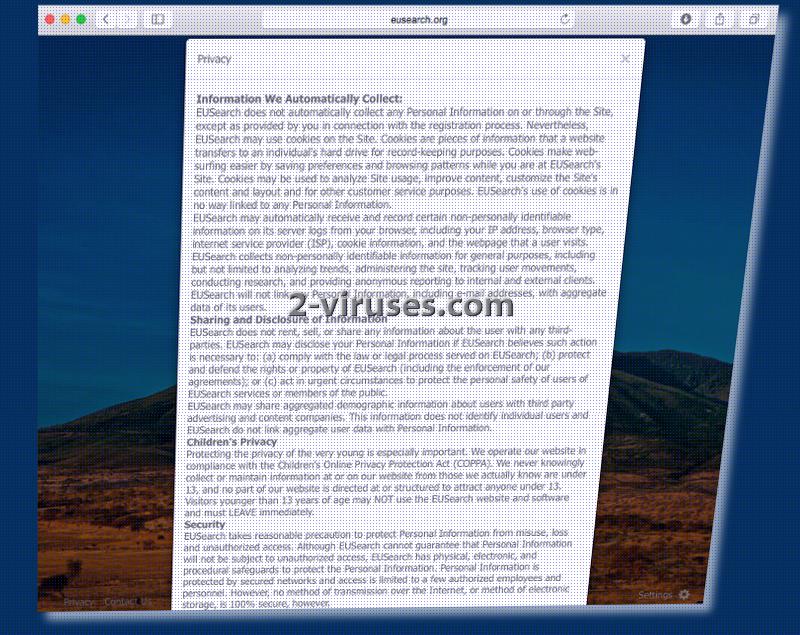 Eusearch.org virus - How to remove March 28, 2017 By Giedrius Majauskas Eusearch.org first opened doors in November of 2016 and its popularity has grown over time, but the increase in the web traffic statistics might have not occurred organically. Currently, global ranking of this domain is quite solid: 379,347 which means that many people might be infected with this browser hijacker, automatically redirecting them to this unknown search platform. Eusearch.org: not a steady searching facility However, in a group of countries, the website has gained more attention: in Germany the website stands in the 85,719 position. 21.91% of all visitors come from Germany. Second position is obtained by the United Kingdom with 18%. The following positions go as this: the Netherlands with 15.59%, France with 12.12% and Sweden with 9.26%. Our investigation showed that there are three websites that Eusearch.org website earns traffic from referrals that are initiated by these three domains: cdn2.crichd.info, folkhogskola.nu, futuresplus.tradestation.com. In total, the rogue search platform should receive 383 unique visitors daily. If our predictions were to turn out true, none of these visitors actually wish to enter this domain, but they are dragged to it by viruses or malicious websites. Eusearch.org gives users’ a chance of replacing notable search engines with a new platform. The freshly detected platform is a Scottish take on a network for searching. The interface of Eusearch.org displays a mountain scenery with a small glimpse of wild nature, but its background should not be the determinant factor when it comes to selecting a secure search platform. Developers of the latter website might not be prepared to safeguard their user community from malicious infections. Eusearch.org can choose to organize its search results in unusual ways, meaning that the top-listed websites can belong to not the most trustworthy websites and services. After Eusearch.org browser hijacker starts dominating in browsers, its website will be regularly presented to users as home pages, new tab pages and default search providers. If you try to access another search engine, this virus may redirect you to its own platform instead. Before you fully wipe out this infection, you won’t be permitted to assign other domains as your browsers’ preferences. Additionally, we have reason to believe that the same people are behind this browser hijacker and Super-search.org that we discovered yesterday. Both of them feature identical Privacy Policies. What do these Privacy Policies reveal? Mostly, information about how Eusearch.org virus will exploit tracking cookies and for what purposes will the gathered material be used. According to the document, collected info will be put in motion to make web-surfing easier. At some cases, Eusearch.org layout might change for the sake of incorporating promotional content. The service will try to endorse visitation to websites that it has agreed to co-operate with. For example, while executing different searches, we noticed that some URLs were not exactly relevant to the query or were leading to domains that would not be assigned in such top positions by more notable searching networks. Advertisements from unknown vendors or random third-parties may be shown by Eusearch.org virus. Various technical support scams, suggesting that your device must be cleaned from spyware, are not to be taken seriously. While this might be a more frightening notification, Eusearch.org virus can open more inviting content. For instance, it can generate pop-ups with surveys or lotteries that will promise to giveaway expensive goods for participation in them. Browser hijackers can, at times, slow your computer down and make it more exposed to additional malware infections. Do you wish to prevent Eusearch.org virus from monitoring your browsing patterns and bothering you with deceptive ads? Then, there are two options to get rid of the Eusearch.org virus. We did not discover a browser extension that would be the official distributor of this browser hijacker. Therefore, we cannot identify which application might have brought this infection in your device. However, Spyhunter will detect potentially unwanted programs, adware apps and, of course, browser hijackers, without any delays. How can you become infected with Eusearch.org virus? Eusearch.org virus is an infection which is a rather easy to catch. All you have to do is prepare a free application and carelessly skip trough the steps of the installation. Setup Wizards very frequently reveal a lot of significant information about the app you selected. For example, you can notice that additional programs are being offered. You should have no interest in installing any of the recommended applications. To avoid inconveniences in the future, select advanced/custom modes for installations and review the application properly. Allowing a program to install everything it has to offer won’t end in your favor. Eusearch Org Virus quicklinksEusearch.org: not a steady searching facilityHow can you become infected with Eusearch.org virus?Automatic Malware removal toolsManual removal of Eusearch.org virusHow to remove Eusearch.org virus using Windows Control PanelHow to remove Eusearch.org virus from macOSAutomatic Malware removal tools Download Spyhunter for Malware detection(Win) Note: Spyhunter trial provides detection of parasites and assists in their removal for free. limited trial available, Terms of use, Privacy Policy, Uninstall Instructions, Download Combo Cleaner for Malware detection(Mac) Note: Combo Cleaner trial provides detection of parasites and assists in their removal for free. limited trial available, Terms of use, Privacy Policy, Uninstall Instructions, Refund Policy , Manual removal of Eusearch.org virus How to remove Eusearch.org virus using Windows Control Panel Many hijackers and adware like Eusearch.org virus install some of their components as regular Windows p