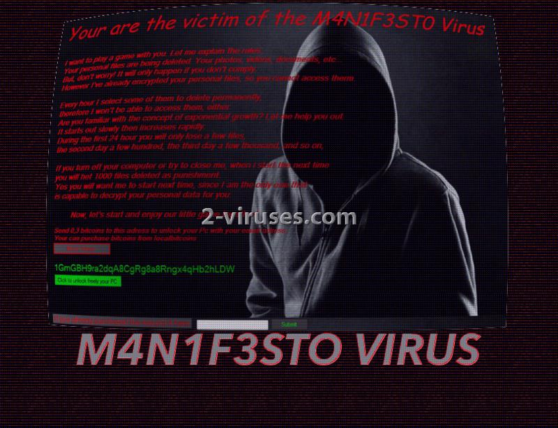 M4N1F3STO virus - How to remove December 13, 2016 By Giedrius Majauskas One of the latest ransomware samples is curable without the necessity of sending transactions of BTC to creators of this virus. IT specialists have diagnosed an appropriate recovery treatment for users that have fallen into despair due to dastardly M4N1F3STO virus. Ideas about to which category this infection belongs to fluctuate from referring to it as a ransomware or identifying it more generally, as a Trojan. We completely understand why this infection might not be freely assigned to the ransomware clan, but we have to admit that there are some instrumental similarities between the group and M4N1F3STO. It does lock your screen and demand a fee. However, the ransom is not demanded for a decryption code/software. M4N1F3STO simply threatens to gradually delete more and more files. The longer victims procrastinate, more data is going to be permanently destroyed. To finish this introductory paragraph, we should mention that the creators of this sample might have watched too much Saw, as they feel extremely eager to “play a game”. What is manifest M4N1F3STO virus about? Challenges that M4N1F3STO virus wants you to deal with are completely deceptive. Since this variant does not bother with the encryption of your data or select complicated ciphers for this job, its way of proceeding is less sophisticated. Remember those threats about gradually deleting your files? Security researchers chuckle, as M4N1F3STO virus throws these frightening declarations without feeling obligated to actually implement them. Why bother, if it is enough to convince people that a harmful process is in progress? When a naive victim starts to fear for the safety of his/hers files, then it is much more easy to persuade them to purchase Bitcoins and send them to hackers. Long story short, the main objective for this virus is to infiltrate into devices and modify Windows Registry Keys by adding additional entries in. Then, M4N1F3STO virus will display a frightening lock screen which will mock victims with inappropriate language and rude attitude. All of the statements in the message are lies as neither encryption, nor deletion of your files occurs. Even though, some desperate victims are going to send 0.3 BTC (according to the latest rates: 233.84 US dollars), the received code is going to trigger an additional window, mocking users for their simplicity. As it turns out, there is no actual reason to send BTC to the hackers. The code to escape the lock screen is also quite disturbing: you can find it in the image below. How to escape the lock screen and secure your files from M4N1F3STO virus? We are going to keep this paragraph short. In the section above, we already explained that it is enough to enter the code and the lock screen will close. If for some reason the screen remains, you can explore an alternative method. You should reboot your device in a Safe Mode with Networking and run a scan with an anti-malware tool of your selection. Spyhunter or Malwarebytes is one of the possible candidates for this task. If you already have a reliable program, it will surely detect some infections and offer the option of removal. Distribution methods for M4N1F3STO virus: what are they? IT specialists are debating how people can receive this Trojan-slash-ransomware. It is possible that the payload is hiding in email letters. That is why you should never freely download attachments from your inboxes without making sure that the sender is trustworthy. In many cases, infectious letters claim to be from authorities that demand you to address some issues regarding your taxes, account info, flight tickets or etc. In reality, these emails are fake and the indicated issues are not even relevant to you. Sometimes, even by opening a malicious email, you might become infected. For this reason, you should always be prepared to delete suspicious emails from your account. Update of the 19th of December, 2016. A new version of M4N1F3STO screen locker has been detected. This new variant of the virus does actually encrypt data. The decryptor has been created by Michael Gillespie, who can be found on Twitter. As it is seen from the latter screen, the updated version of M4N1F3STO trojan pretends to be a Windows update, about which the user is informed by the so-called Microsoft technician Jhon Woddy. Automatic Malware removal tools Download Spyhunter for Malware detection(Win) Note: Spyhunter trial provides detection of parasites and assists in their removal for free. limited trial available, Terms of use, Privacy Policy, Uninstall Instructions, Download Combo Cleaner for Malware detection(Mac) Note: Combo Cleaner trial provides detection of parasites and assists in their removal for free. limited trial available, Terms of use, Privacy Policy, Uninstall Instructions, Refund Policy , M4N1F3STO virus facts Type: Ransomware Download Spyhunter for Malware detection(Win) Note: Spyhunter trial provides detection of parasites and assists in their removal for free. limited trial available, Terms of use, Privacy Policy, Uninstall Instructions, Download Combo Cleaner for Malware detection(Mac) Note: Combo Cleaner trial provides detection of parasites and assists in their removal for free. limited trial available, Terms of use, Privacy Policy, Uninstall Instructions, Refund Policy , TOC Leave a ReplyYour email address will not be published. Required fields are marked *Comment * Name * Email * Website