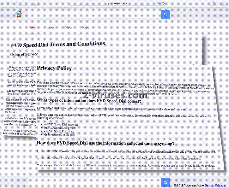 My.yoursearch.me virus - How to remove February 24, 2017 By Giedrius Majauskas FVD Speed Dial, a company from USA, has manufactured My.yoursearch.me search engine, but its productivity is not astonishing. Actually, this platform is open to doubt because security researchers are identifying it as a browser hijacker. It means that it invades browsers’ settings and assigns new domains to stand in places of formerly selected preferences. You can set your preferences after opening settings of browsers and selecting websites to be opened as home pages, new tab pages and default search providers. My.yoursearch.me can be recognized as a search engine as soon as people enter this website, but remember that it is not a practical selection. Browser hijackers refuse to be responsible for the content it distributes and introduces to users. Every time people handle their search queries via this platform, all of the possible threats rest on their own shoulders. Presumably, the most compatible search engines for this browser hijacker to infect are Mozilla Firefox, Internet Explorer and Google Chrome. Things to remember about My.yoursearch.me virus My.yoursearch.me virus won’t easily give up its positions in browsers’ preferences. Some surfers might not find these modifications annoying since My.yoursearch.me will provide them with results to search queries. However, their quality is another discussion and people might come to realize that they are constantly exposed to a bunch of unfamiliar links that they had never visited before. It is true that browser hijackers can combine links of their partners and feature them in the results to search queries page. The problem is that some of the websites that My.yoursearch.me virus can be associated can have malicious plans in their minds. Worst case scenario, URLs that are found could be filled with malware, attempt to deceive you into disclosing some personal information or have other objectives in their agenda. My.yoursearch.me virus should not be treated as legitimate searching facilities do. Even though it appears to display results from its own resources, we express great doubts about its actual trustworthiness. Since it is regarded as a browser hijacker, we could not think of any pros to using this searching facility. The websites provides services “as is” and it simply does not express any warranties for the content, made available via its site: “FVD Speed Dial does not warrant, endorse, guarantee, or assume responsibility for any product or service advertised or offered by a third party through the service or any hyperlinked website or service, or featured in any banner or other advertising”. My.yoursearch.me explains that every user has to understand that the presented material can be considered offensive, inaccurate, objectionable or inappropriate. Also, in the EULA document of My.yoursearch.me virus, we read conditions, explaining: “search engine might allow third-parties, including advertising companies, and ad networks, to display advertisements on our website and applications. There companies can exploit tracking technologies, such as cookies, to collect information about users who view or interact with their advertisements.” This would not be dangerous if we would know that the submitted promotional content would be pre-checked before it is actually presented to Internet users, but this does not seem to be the case. How does My.yoursearch.me virus manage to enter your device? My.yoursearch.me virus can affect your device in multiple ways. One of them might occur due to your browsing habits since you can encounter a lot of unreliable third-party content (potentially malware-laden). In addition to that, another malware distribution method is to download viruses together with free applications from the Internet. In order to download software, always find reliable distributors. When you do download an installer for the app you wish to have, please be careful while attempting to finish a Setup Wizard process. Carefully follow every step and read everything that is provided. If you follow these advises, you should learn whether your selected program will initiate any unnecessary changes or install more programs than was originally implied. Main aspects of manual removal are identified in the following sections. Spyhunter or Malwarebytes are completely reliable anti-malware tools that will adequately protect computer systems. Their malware-removing skills are top-notch and My.yoursearch.me will not be able to defend itself. My Yoursearch Me Virus quicklinksThings to remember about My.yoursearch.me virusHow does My.yoursearch.me virus manage to enter your device?Automatic Malware removal toolsManual removal of My.yoursearch.me virusHow to remove yoursearch virus using Windows Control PanelHow to remove yoursearch virus from macOSAutomatic Malware removal tools Download Spyhunter for Malware detection(Win) Note: Spyhunter trial provides detection of parasites and assists in their removal for free. limited trial available, Terms of use, Privacy Policy, Uninstall Instructions, Download Combo Cleaner for Malware detection(Mac) Note: Combo Cleaner trial provides detection of parasites and assists in their removal for free. limited trial available, Terms of use, Privacy Policy, Uninstall Instructions, Refund Policy , Manual removal of My.yoursearch.me virus How to remove yoursearch virus using Windows Control Panel Many hijackers and adware like My.yoursearch.me virus install some of their components as regular Windows programs as well as additional software. This part of malware can be uninstalled from the Control Panel. To access it, do the following. Start→Control Panel (older Windows) or press Windows Key→Search and enter Control Panel and then press Enter (Windows 8, Windows 10). Choose Uninstall Program (if you don't see it, click in the upper right next to "View by" and select Category). Go through the list of programs and select e