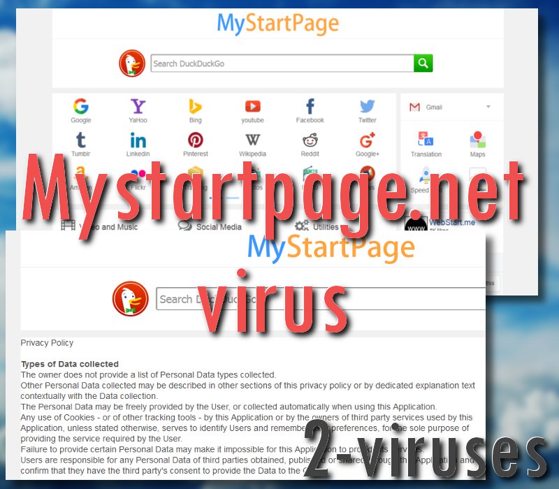 Mystartpage.net virus - How to remove April 3, 2018 By Giedrius Majauskas Mystartpage.net virus is a browser hijacker, completely identical to Newtab.pro infection we discussed last week. RCPSoft company has been responsible for some of the malicious programs that we have discussed. For instance, NetGroove browser is a product from RCPSoft and it is very likely to bring a browser hijacker as well. Therefore, you should be careful not to install any of the applications that this company is offering. In order to display results to search queries, Mystartpage.net virus uses DuckDuckGo search engine. However, we suspect that these results will be filled with sponsored results, deceptive links that might lead to malicious or harmful websites. Mystartpage.net malware parasite will make unwanted modifications to your browsers’ settings Mystartpage.net hijacker acts very intrusively. According to the privacy policy of this search engine, the RCPSoft does not provide information about which types of data is going to be collected. By not providing a list of personal data gathered, the browser hijacker is capable of gathering information which is highly private (Malware, hacking and protecting personal information: Dispelling harmful myths). For instance, the virus could constantly spy on your online activities and collect information you provide to various websites. Therefore, if you are logging into your online banking account, credentials might be stolen by this hijacker. We also notice that the hijacker will use marketing cookies which are exploited to track visitors across websites. The intention is to display ads that are relevant and engaging for the individual user and thereby more valuable for publishers and third-party advertisers. Therefore, it is clear that you will notice a lot of personalized online adverts (Ads Online – Why Are They Following You Around The Web? ). Not all of these advertisements are going to reliable. Some of them could expose you to technical support scams, fake surveys and other deceptive material. We also have noticed other browser hijackers that are related with this Mystartpage.net virus. Webstart.me is another infection which is suspected to be related with the latter infection. If you want to enjoy a private and safe browsing, you should not install unknown programs or allow third-party search engines to be featured in home pages, default search provider and new tab page. Unknown search engines use a lot of tracking cookies, display deceptive personalized ads and can even automatically redirect you to unknown websites. Overall, Mystartpage.net virus might not be a very dangerous infection, but it remains to be a suspicious search engine to use. Software from RCPSoft might be installed without your permission, and you will suddenly notice that your browsers’ preferences have been modified without authorization as well. If you want to get rid of this hijacker, continue on reading this article. How can you become infected with this Mystartpage.net virus? Mystartpage.net virus can be installed together with other programs. If you notice that an unknown program has managed to slither into your operating system, please make sure to find out the reason behind this. Take a look at the Control Panel and remove all tools that are related with RCPSoft company. If you are still experiencing issues, it would be best to run a full scan with an anti-malware tool. While you are installing free programs from the Internet, make sure to refuse recommendations to get optional applications. Some of them might be considered potentially unwanted programs (PUPs). Therefore, it is crucial to keep your operating system free of any potentially damaging programs. Therefore, we hope you will seriously consider getting Spyhunter anti-malware tool. This program will help you detect all suspicious applications and files. If this security program suggests you to remove something, you should definitely pay attention to these recommendations. Since malware can slither into your device very easily, it is important to run regular scans. Automatic Malware removal tools Download Spyhunter for Malware detection(Win) Note: Spyhunter trial provides detection of parasites and assists in their removal for free. limited trial available, Terms of use, Privacy Policy, Uninstall Instructions, Download Combo Cleaner for Malware detection(Mac) Note: Combo Cleaner trial provides detection of parasites and assists in their removal for free. limited trial available, Terms of use, Privacy Policy, Uninstall Instructions, Refund Policy , Removal guides in other languages Mystartpage.net-Virus (de) El virus Mystartpage.net (es) Mystartpage.net virus (dk) Mystartpage.net virus (it) Mystartpage.net virus facts Type: Browser Hijacker Download Spyhunter for Malware detection(Win) Note: Spyhunter trial provides detection of parasites and assists in their removal for free. limited trial available, Terms of use, Privacy Policy, Uninstall Instructions, Download Combo Cleaner for Malware detection(Mac) Note: Combo Cleaner trial provides detection of parasites and assists in their removal for free. limited trial available, Terms of use, Privacy Policy, Uninstall Instructions, Refund Policy , TOC Leave a ReplyYour email address will not be published. Required fields are marked *Comment * Name * Email * Website