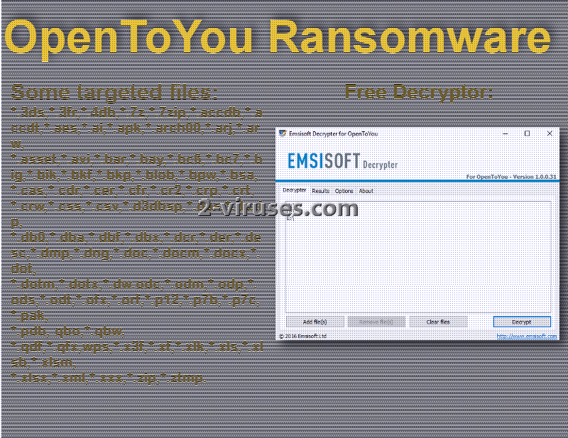 OpenToYou ransomware - How to remove January 3, 2017 By Giedrius Majauskas Introducing crypto-ransomware viruses that have been successfully conquered and sent to the grave yard is a real pleasure. OpenToYou virus is a sample that we dare to identify as defeated. We should mention that this infection is not old. Therefore, it is surprising that IT specialists managed to generate an appropriate decryption tool so quickly. Our praises travel to the developers of Emsisoft that introduced the tool for decryption just a couple of days ago, exactly before the New Years. We guess it is better to begin a new year with a fresh slate instead of battling demons from the past. Anyway, OpenToYou crypto-ransomware virus was noticed to infect devices and encrypt various types of data with RC4 cipher. The email contact left to contact the hackers is [email protected]. Despite being curious about what the hackers behind this attack have to say, you should not send them a letter. No amount of begging or threatening will force shady programmers to give away the secrets of decryption. Luckily, OpenToYou virus has been figured out and you can download the decryptor, constructed by Emsisoft. What can more can we state about OpenToYou ransomware? OpenToYou virus is put in the same group as any other crypto-ransomware. It is not picky when it comes to files that are suitable for its initiated encryption: an impressive (and disturbing) number of files can be selected to be encoded with RC4 nightmare. Nevertheless, OpenToYou virus might have been not a complicated example since security researchers did craft a functional and free tool, meant to restore the ruined data. Victims have indicated that all sorts of files were corrupted: from .doc, .docm, .docx, .odt, .png, .jpg to a few hundreds of other extensions that almost every files has. The research about OpenToYou virus also discovered that even those files that did not have any extensions were selected for encryption. To separate the encoded data from the normal executables, every piece of data is going to be appended with [email protected] email address of the hackers. We guess this is another encouragement to contact the creators of OpenToYou ransomware and learn their true intentions, since the presented ransom is not that informative (its called !!!.txt). The message from hackers is going to be seen in two places: as a new background and in the .txt executable. The latter one is also going to contain an original identification key which will be different for every victim of OpenToYou ransomware. However, even though the ransomware poses a threat to a lot of file types, it is important where in the system is the executable stored. OpenToYou virus seems to avoid some folders and leave its data intact. Examples of such categories: Program Files, Intel, Boot, PerfLogs, Driver, Windows, Logs and couple of others. This means that data in these sections is safe from this ransomware infection. However, data in other folders is more than available for encryption. Good news: you can decrypt files that have been corrupted by OpenToYou ransomware OpenToYou virus can be added to the variants that have been cracked: you can download a free tool for decryption from Emsisoft official website. If you are having trouble detecting the exact place, simply click here and we will redirect you to a proper part. This means that if you are infected with OpenToYou ransomware, you won’t have to suffer from majors financial or data losses. However, this positive news cannot be applied to all of the ransomware around. Some of them are difficult to crack. That means that it is important to know appropriate ways how to protect your data from algorithms for encryption. If you have your precious files stored in backup storages, you won’t care if their originals will get encrypted: you will be able to retrieve copies of those files that function just fine. Aspects, concerning the transmission of OpenToYou ransomware It is possible that the payload of OpenToYou ransomware is distributed in malicious email letters. This a tip for the future as well: never open letters that are announced to be extremely urgent, but their grammatical mistakes and email address indicate that this might not be a reliable letter. Most of the time, email letters will contain an attachment that you will have to download in order to get infected with a ransomware. However, new research discovered that hackers are able to infect people after they simply open the emails they receive. Spyhunter are the professional tools you have been missing: these anti-malware programs will automatically take care of the OpenToYou ransomware. Further sections explain manual removal and decryption, but that should not concern you since you should take advantage of the tool, generated by Emsisoft. Opentoyou Ransomware quicklinksWhat can more can we state about OpenToYou ransomware?Good news: you can decrypt files that have been corrupted by OpenToYou ransomwareAspects, concerning the transmission of OpenToYou ransomwareAutomatic Malware removal toolsHow to recover OpenToYou ransomware encrypted files and remove the virusStep 1. Restore system into last known good state using system restore1. Reboot your computer to Safe Mode with Command Prompt:2.Restore System files and settings.Step 4. Use Data Recovery programs to recover OpenToYou ransomware encrypted filesAutomatic Malware removal tools Download Spyhunter for Malware detection(Win) Note: Spyhunter trial provides detection of parasites and assists in their removal for free. limited trial available, Terms of use, Privacy Policy, Uninstall Instructions, Download Combo Cleaner for Malware detection(Mac) Note: Combo Cleaner trial provides detection of parasites and assists in their removal for free. limited trial available, Terms of use, Privacy Policy, Uninstall Instructions, Refund Policy , How to recover OpenToYou ransomware encrypted files and remove the virus Step 1. Restore s