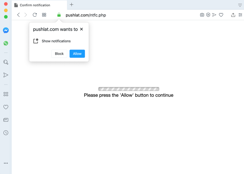 When pushlat.com initially attacks your browser, the hijacking mission is not accomplished yet. To do that, the malicious resource uses deceptive and sometimes scary alerts instructing you to click on its integrated “Allow” button. For instance, the following message is typically displayed: