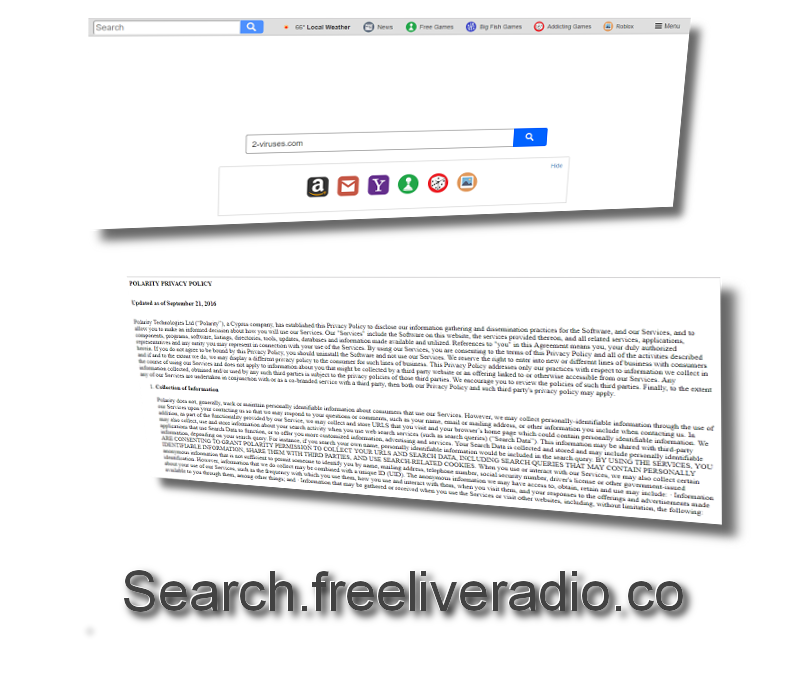 Search.freeliveradio.co - How to remove August 22, 2017 By Giedrius Majauskas Wouldn’t you like to listen to various radio stations right on your web browser, without having to browse a number of different websites looking for streams? Search.freeliveradio.co is offering this feature for free, but at the same time brings a lot of troubles regarding your cyber security. For that reason it is listed as a browser hijacker – it will definitely take over your web browsers by changing important settings and overstepping boundaries. It operates as an internet browser extension and is capable of changing home page, default search engine and new tab website settings without asking your permission. Search Freeliveradio Co quicklinksFreeliveradio.co is a browser hijackerSneaking into computersAds and bundlingAutomatic Malware removal toolsGet rid of Search.freeliveradio.co virusHow to remove freeliveradio using Windows Control PanelHow to remove freeliveradio from macOS Download Spyhunter(Win) Note: Spyhunter trial provides detection of parasites and assists in their removal for free. limited trial available, Terms of use, Privacy Policy, Uninstall Instructions, Download Combo Cleaner(Mac) Note: Combo Cleaner trial provides detection of parasites and assists in their removal for free. limited trial available, Terms of use, Privacy Policy, Uninstall Instructions, Refund Policy , Actually, the name of the extension is “Live Radio Pro Tab” (by Eightpoint/Polarity) and, in some cases, the freeliveradio.co page has been replaced with tliveradiopro.com. Still, the hijacker functions the same regardless of which address is used. It is found to be suspicious by multiple reputable antivirus vendors, There are tons of similar browser hijackers that offer free radio streaming, such as MyRadioAccess or Search.searchlttradionow.com, and they all work more or less the same, thus we already know them quite well and dealing with them is not that difficult (in most cases). Removing freeliveradio.co should be complemented with removing other suspicious browser extensions because they might have also been installed with freeliveradio.co, even if they do not show up. Also, you might want to scan your computer for adware – it’s probably clean, but hijackers are known to spread using misleading ads. Freeliveradio.co is a clunky and inelegant browser toolbar at best – ad-pushing, spying, browser-hijacking malware at worst. It should probably be uninstalled: Classification Browser hijacker Adware Symptoms Home page replaced with search.freeliveradio.co, tliveradiopro.com, “Live Radio Pro Tab”, or similar Search results returned in search.yahoo.com or hidemysearches.com Can’t delete the extension in the normal way Distribution Bundled with freeware Downloaded by malware Installed by following deceptive ads Removal Remove malware from the computer (SpyHunter for PC, Combo Cleaner for Mac) Uninstall freeliveradio.co and related extensions manually Freeliveradio.co is a browser hijacker Sneaking into computers The freeliveradio.co infection was developed by a well-known malware developer Polarity Technologies LTD. This company never seems to take a day off and new browser hijackers show up constantly. “New” being relative – the design is often the same, only the name is different. We have already mentioned that this infection is operating as an internet browser extension and it seems that Search.freeliveradio.co is compatible with all most popular web browsers, such as Google Chrome, Internet Explorer, and Mozilla Firefox. The extension can be downloaded for one browser, or it can come as a more serious infection. Most concerning is that freeliveradio.co can be installed without your consent. Browser hijackers are sometimes distributed using bundling and installed by malware, so if that happened to you, then you’d see “Live Radio Pro Tab” in your browser without ever having installed it on purpose. But even when it’s manually installed, that doesn’t mean that consent was obtained. Accidentally installing an extension by following instructions on freeliveradio.co is easy to do without even realizing what you’re doing, especially if you don’t have experience using browser extensions. Deceptive installation tactics is what that’s called. When freeliveradio.co infects your computer, it automatically adds this extension to all web browsers installed on your computer. Then the extension changes settings – sets www.search.freeliveradio.co as homepage and default search engine, so this website appears every single time you open a web browser or try to search for something on the Internet. Ads and bundling All searches submitted to Search.freeliveradio.co are redirected to Yahoo. That’s not a danger in itself – it is completely reliable and safe, even if the number of ads might be a bit high. Search.freeliveradio.co is dangerous for other reasons and the most important one is data collection. Once inside of your computer it will collect all sorts of data about you – your web browsing habits, IP and email addresses, software and hardware you are using, and much more. This information is used to adjust advertisements and target them directly to you, regarding your interests. It can also be sold to various third parties, which is not good for privacy. If you take a look at the freeliveradio.co new tab page, you will notice a toolbar pinned to it. They are using it to promote affiliated products. One of them is called ‘Weatherly’ – a free tool that is supposed to inform you about weather forecasts in your city. This add-on is promoted by all browser hijackers delivered by Polarity Technologies LTD, thus we consider it to be malicious as well – avoid that add-on. Oh, and let’s not forget that, when installing freeliveradio.co on Chrome, you’re forwarded to HideMySearches and Email Search Tools installation pages. These extensions will hijacker your browser much more thoroughly (