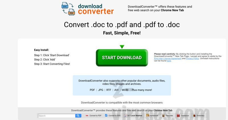Search.searchdconvertnow.com Virus - How to remove December 28, 2016 By Giedrius Majauskas Download Converter Now is the free app, which, as it is self-explanatory from its title, is a program, which functions as a file converter. However, it is not an ordinary application, which you could download and install on your PC to have it on the hard drive. Download Converter Now file-converter is bundled with another application, which is, actually, a web application, functioning as a browser extension. It is the Search.searchdconvertnow.com application. Its relation with the latter file conversion tool is apparent in its title. The letter d stands for the word download, the other words, which the name of the Download Converter Now app contains, are not abbreviated. If you look once again into the first page your web browser loads, you are sure to notice the Download Converter Now inscription on the right upper corner of the page and the Convert To PDF, as well as Convert To DOC links below the search bar. Thus, interconnection between the Download Converter Now file converter and the Search.searchdconvertnow.com extension cannot be denied. Download Converter Now app is available on the chrome.google.com website, which is the official website of chrome web store. It is available for free there, however, the app’s compatibility is limited to the Google Chrome web browser. In addition to this, Download Converter Now includes additional functionality, that of the changing of the browser settings as regards the DNS configuration. As it is disclosed in the description of the program provided on the online store: Download Converter Now changes your current new tab page and new tab search functionality. Which refers to the fact that once you have downloaded the converter, your homepage will be replaced with Search.searchdconvertnow.com, which is an add-on supposed to be having a web search functionality. Download Converter Now is also available on its official website, that of downloadconverternow.com: From here you can download the versions of the app, which are compatible with Mozilla Firefox, Internet Explorer, and even the software by Apple, which is, in this case, the Safari browser. No matter what source you choose to download the file converter from, your browser’s start page will be changed with Search.searchdconvertnow.com, which is not, actually, an online search tool, but a browser hijacker. And Download Converter Now program is a mere lure to have the users’ computers infected with the latter hijackware infection. Search.searchdconvertnow.com is, in fact, an online advertising tool, redirecting to search.yahoo.com search compromised by the advertising content of unknown advertising companies: When Search.searchdconvertnow.com plug-in is redirecting your web searches, it is pretty easy to land on some suspicious third-party advertising site or click on some malicious ad, generated by unknown publishers. Either of the latter web journeys can possible end in the viral infection of your computer’s system. For this reason, the users, who have their homepage replaced by Search.searchdconvertnow.com are recommended to remove the app together with its supplements – the most importantly together with the Download Converter Now app. The removal of the Search.searchdconvertnow.com app can be accomplished with Spyhunter or Hitman antivirus applications. Even though Search.searchdconvertnow.com is a relatively new cyber threat reported, the databases of the latter anti-malware tools are updated regularly. In addition to this, you will find the manual removal guide of the hijacker below the post, which will cover the manual removal details from the most widely-used browsers. As regards the best removal method to be chosen, be wise. The above named security applications are recommended because no manual removal instructions can help you do all the tasks, which are needed to be done in the face of hijackware infection. In the latter case, it is highly possible that we are talking about a multiple adware infection, which can only be terminated in the automatic way. Searchdconvertnow Virus quicklinksAutomatic Malware removal toolsManual removal of Search.searchdconvertnow.com VirusHow to remove searchdconvertnow Virus using Windows Control PanelHow to remove searchdconvertnow Virus from macOSAutomatic Malware removal tools Download Spyhunter for Malware detection(Win) Note: Spyhunter trial provides detection of parasites and assists in their removal for free. limited trial available, Terms of use, Privacy Policy, Uninstall Instructions, Download Combo Cleaner for Malware detection(Mac) Note: Combo Cleaner trial provides detection of parasites and assists in their removal for free. limited trial available, Terms of use, Privacy Policy, Uninstall Instructions, Refund Policy , Manual removal of Search.searchdconvertnow.com Virus How to remove searchdconvertnow Virus using Windows Control Panel Many hijackers and adware like Search.searchdconvertnow.com Virus install some of their components as regular Windows programs as well as additional software. This part of malware can be uninstalled from the Control Panel. To access it, do the following. Start→Control Panel (older Windows) or press Windows Key→Search and enter Control Panel and then press Enter (Windows 8, Windows 10). Choose Uninstall Program (if you don't see it, click in the upper right next to "View by" and select Category). Go through the list of programs and select entries related to searchdconvertnow Virus . You can click on "Name" or "Installed On" to reorder your programs and make Search.searchdconvertnow.com Virus easier to find. Click the Uninstall button. If you're asked if you really want to remove the program, click Yes. In many cases anti-malware programs are better at detecting related parasites, thus I recommend installing Spyhunter to identify other programs that might be a part of this infection. How to remove searchdcon