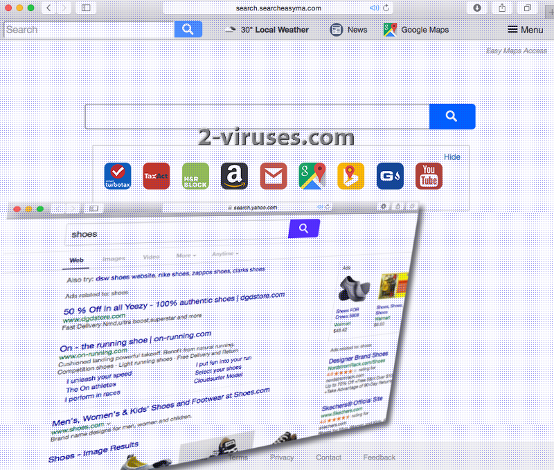 SearchEasyMa.com virus - How to remove February 16, 2017 By Giedrius Majauskas SearchEasyMa.com is not a celebrated search engine: it is more of black sheep in the family of these networks. Polarity Technologies LTD is the founder of this search platform, but we cannot imagine that much effort could have gone into making this product. The latter company consistently produces fake search networks that look exactly the same. Usually, these invaders are distributed by browser extensions that insert an additional toolbar with shortcuts to a certain area-related websites. And, in addition, people that download them will agree to set their home, new tab page and default search to a unique search engine, belonging to Polarity. If you are accustomed to seeing certain websites in these positions, you might be utterly disappointed when they are no longer opened. People could be especially surprised by a visit of SearchEasyMa.com virus because they can install it accidentally, without any intention to actually pursue such action. In this case, Easy Maps Access browser extension delivers a browser hijacker, together with the, truth be told, unnecessary toolbar. Creating a profile for SearchEasyMa.com virus Internet surfers, bothered by various fake search engines, usually do not report them for quite sometime. This common mistake is probably repeated over and over by different people as they do not really express gigantic interest in which search engine delivers their results to search queries. As long as they get the links they need, they are satisfied. However, the selection of the preferred search platform is surprisingly important, essential even. If you explore the Internet via an unknown network, originated from the hands of a company that has been notorious for creating browser hijackers, your cybersecurity is at stake. The main issue with SearchEasyMa.com virus and basically any other malware threat is that users cannot rely on them. You can never foresee the next move from such infections: it can install a malware threat in your device, it can display irritating advertisements, it can cause sudden redirection. Based on these statements, we encourage people to repress their desire to exploit SearchEasyMa.com search engine and the temptation with its produced promotional content. If you do not cast such offers down, your computer system will surely suffer from a series of inconveniences. Drop SearchEasyMa.com virus from your preferences like a hot potato and enjoy peaceful browsing once again. Keeping this fake search network around won’t be beneficial nor to you nor to your controlled device. It is only a matter of time when your system will be constantly interrupted by freezes, crashes, floods of ads, redirection and so on. The activity that you daily pursue online can also be tracked as SearchEasyMa.com virus can insert tracking cookies, small files, into your hard drive and store this information. To finish this section of the article off, we are not going to drop any major bombs on you. Nevertheless, we will risk repeating ourselves and remind visitors that keeping SearchEasyMa.com and its browser extension requires an intervention. If you notice a new toolbar and a search platform that delivers results from Yahoo, do not hesitate to remove it. Modifications that are initiated without your consent should not be allowed to thrive. SearchEasyMa.com virus does not travel in mysterious ways As we have already indicated, SearchEasyMa.com virus can be delivered to unsuspecting users without their knowledge. This often happens because bundling has become a very popular tactic. You can barely find any applications that would not feature additional software, offered to you during their installation processes. To help users detect such propositions better, security researchers recommend selecting advanced/custom modes. However, there is legitimate way to become jeopardized by SearchEasyMa.com virus. Users can download the Easy Maps Access from its official page. With that download, home, new tab pages and default search provider will not remain the same. Spyhunter or Hitman will support your cybersecurity and offer assistance in malware removal. The automatic option to destroy every trace of SearchEasyMa.com virus is highly-recommended. Another option is to follow instructions below and pursue a goal of removing a browser hijacker by yourself. This might be a little tricky for users that do not have any experience in this field. Searcheasyma Com Virus quicklinksCreating a profile for SearchEasyMa.com virusSearchEasyMa.com virus does not travel in mysterious waysAutomatic Malware removal toolsManual removal of SearchEasyMa.com virusHow to remove SearchEasyMa.com virus using Windows Control PanelHow to remove SearchEasyMa.com virus from macOSAutomatic Malware removal tools Download Spyhunter for Malware detection(Win) Note: Spyhunter trial provides detection of parasites and assists in their removal for free. limited trial available, Terms of use, Privacy Policy, Uninstall Instructions, Download Combo Cleaner for Malware detection(Mac) Note: Combo Cleaner trial provides detection of parasites and assists in their removal for free. limited trial available, Terms of use, Privacy Policy, Uninstall Instructions, Refund Policy , Manual removal of SearchEasyMa.com virus How to remove SearchEasyMa.com virus using Windows Control Panel Many hijackers and adware like SearchEasyMa.com virus install some of their components as regular Windows programs as well as additional software. This part of malware can be uninstalled from the Control Panel. To access it, do the following. Start→Control Panel (older Windows) or press Windows Key→Search and enter Control Panel and then press Enter (Windows 8, Windows 10). Choose Uninstall Program (if you don't see it, click in the upper right next to "View by" and select Category). Go through the list of programs and select entries related to SearchEasyMa.com virus . 