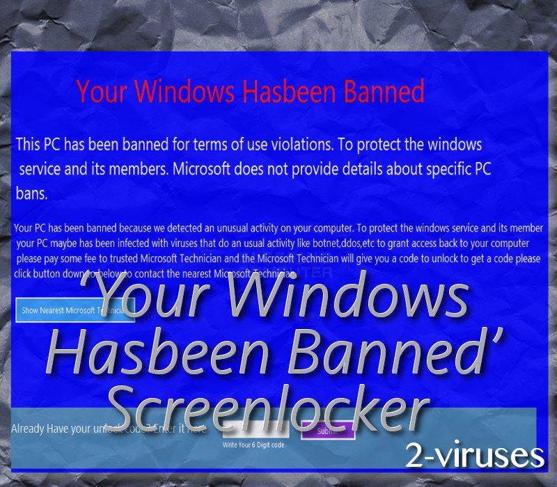 'Your Windows Hasbeen Banned' Screenlocker - How to remove December 20, 2016 By Giedrius Majauskas ‘Your Windows Hasbeen Banned’, also referred to as ‘Your Windows Has Been Banned’, is a relatively new screen locker, which appeared in November, 2016 (the first version). ‘Your Windows Hasbeen Banned’ is, actually, the first version of the screenlocker, while ‘Your Windows Has Been Banned’ is the second version (appeared on the 13th of December, 2016). They are practically identical, just the second version has the typing mistake in its title corrected and it encloses the concrete contact details for support. It is a trojan type of viral infection, since the user of the infected computer is falsely informed that ‘unusual activity’ has been detected on his device and he should, accordingly, contact the nearest Microsoft Technician to solve the security issue. While, in fact, it is a technical support scam on the other hand, just the one, which locks the screen. What You Need to Know About ‘Your Windows Hasbeen Banned’ Screenlocker ‘Your Windows Hasbeen Banned’ trojan can be distributed in a number of ways. No specific manner of its distribution has been identified yet. The most probable channels of ‘Your Windows Hasbeen Banned’ screen locker’s distribution are vulnerabilities in the software of the compromised system and free software downloads. Once the malicious program gets downloaded on the computer, it locks the screen, blocking the user’s access to the machine and displaying the following window (the first and the second versions in a respective order): The text of the window: Your Windows Hasbeen Banned This PC has been banned for terms of use violations. To protect the windows service and its members. Microsoft does not provide details about specific PC bans. Your PC has been banned because we detected an unusual activity on your computer. To protect the windows service and its member your PC maybe has been infected with viruses that do an usual activity like botnet,ddos,etc to grant access back to your computer please pay some fee to trusted Microsoft Technician and the Microsoft Technician will give you a code to unlock to get a code please click button down to below to contact the nearest Microsoft Technician. Users should analyze the security warnings they receive with scrutiny and assess them critically. As if the alert received is a fake one, in most of the cases this is rather clear from the message received itself to understand whether your PC suffers from some kind of virus or its system undergoes real security issues. Let’s look at the above posted warning message, rendered by ‘Your Windows Hasbeen Banned virus’. Even the title contains the typing mistake. In the next sentence of the body of the notification ‘windows’ is written in the lower case, the same is done and in the following part of the text. Typing mistakes by skipping spaces persist. The particular case of the issue is ‘explained’ in a very obscure manner. Moreover, it is practically improbable that Microsoft or any other reputable software developer would offer you various unlock codes to solve security breaches. Besides, the text is full of syntax mistakes as well. No such reputable company as Microsoft would let itself to provide you with such a note. The unlock code, which unlocks the screen, locked by ‘Your Windows Hasbeen Banned’ version is 123456. While, the passcode for ‘Your Windows Has Been Banned’ version is nvidiagpuareshit. After one of the codes have been entered, the virus shows the following message: Thanks for buying the unlock code from me! You are fooled i am not microsoft To Remove My Virus Follow the Instructions 1) Enter “123456” as a Unlock Code 2) Open Start Menu 3) Go to Start Up 4) Delete the exe file “AdvancedRansomware1.exe” The screen can also get unlocked by pressing the combination of Alt+F4 on the keyboard. When the user gets access to his computer, the screenlocker needs to be removed. Download and run Spyhunter or Hitman to have ‘Your Windows Hasbeen Banned’ program removed from your PC. What You Need to Do that ‘Your Windows Hasbeen Banned’ Screenlocker Would Not Infect Your PC You need to take care of your computer’s system. Do not miss software updates and do not install free apps in the Default settings but choose the Advanced or Custom ones to pick the malicious apps out. Because the installers of free applications are typically malware-laden. Automatic Malware removal tools Download Spyhunter for Malware detection(Win) Note: Spyhunter trial provides detection of parasites and assists in their removal for free. limited trial available, Terms of use, Privacy Policy, Uninstall Instructions, Download Combo Cleaner for Malware detection(Mac) Note: Combo Cleaner trial provides detection of parasites and assists in their removal for free. limited trial available, Terms of use, Privacy Policy, Uninstall Instructions, Refund Policy , 'Your Windows Hasbeen Banned' Screenlocker facts Type: Trojan Download Spyhunter for Malware detection(Win) Note: Spyhunter trial provides detection of parasites and assists in their removal for free. limited trial available, Terms of use, Privacy Policy, Uninstall Instructions, Download Combo Cleaner for Malware detection(Mac) Note: Combo Cleaner trial provides detection of parasites and assists in their removal for free. limited trial available, Terms of use, Privacy Policy, Uninstall Instructions, Refund Policy , TOC Leave a ReplyYour email address will not be published. Required fields are marked *Comment * Name * Email * Website